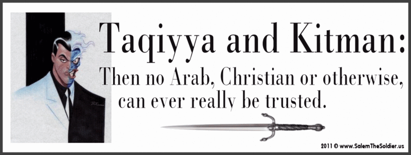 For those of you who don't know, the word taqiyya is an Arabic term used in Muslim jurisprudence. Basically what it means is that if someone pulls a gun out and threatens to shoot you if you confirm you are a Muslim, you are permitted to lie about your faith if it means you don't get shot. Sounds perfectly reasonable to me.